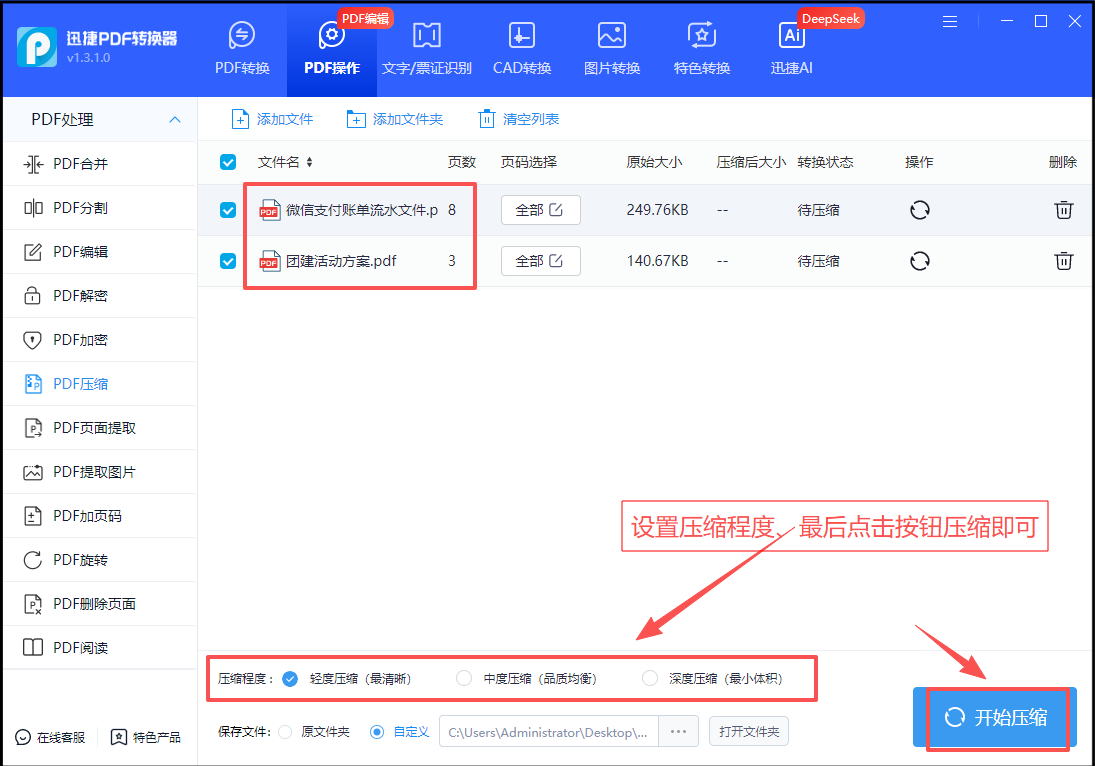 图片文件上传后,在下方设置压缩程度(轻度压缩、中度压缩、深度压缩)、保存文件夹;最后点击【开始压缩】按钮即可!