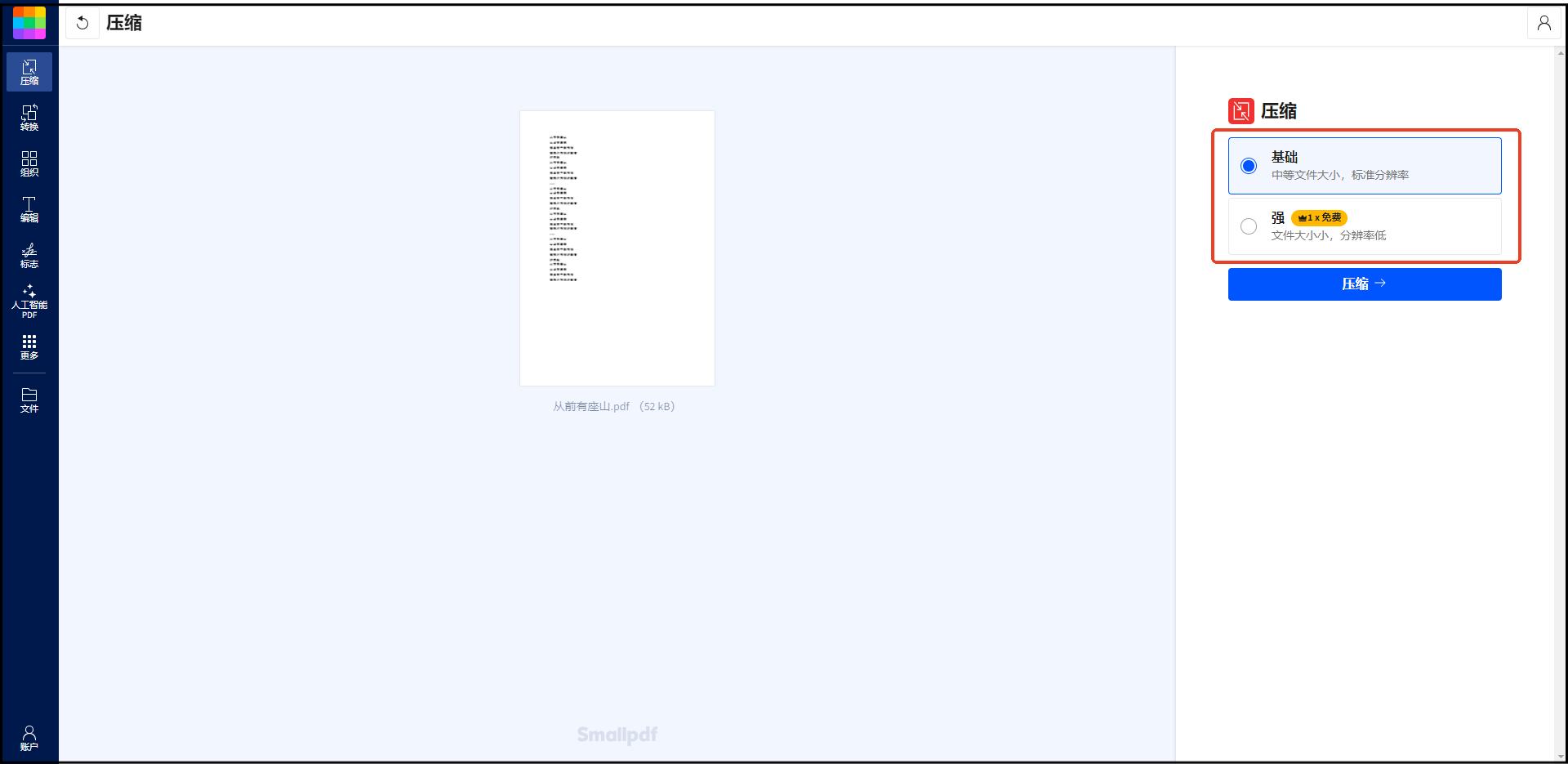 选择压缩模式、点击按钮即可自动处理压缩PDF文件!通常10MB以内的文件几秒就能完成!