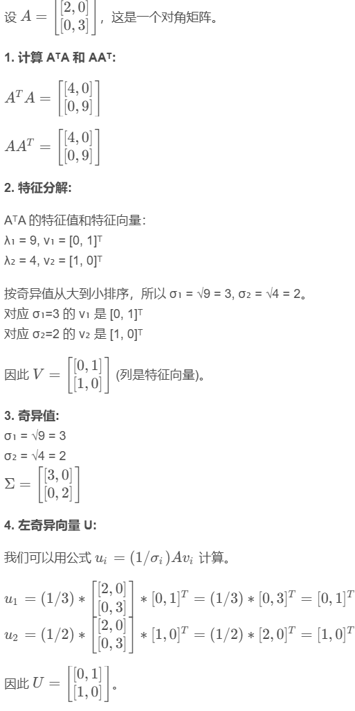 这个例子很简单,但展示了SVD的组成部分, 对于非对角矩阵,计算过程更复杂,但原理相同。