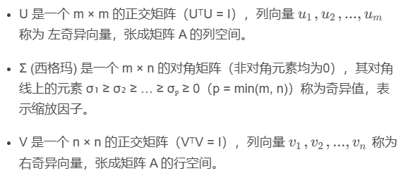 数学定义 对于任意一个 m × n 的实数矩阵 A,其奇异值分解为: