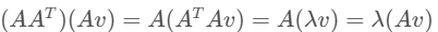 这说明 λ 也是 AAᵀ 的特征值,而其对应的特征向量是 A v(需要归一化)。