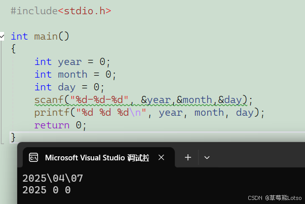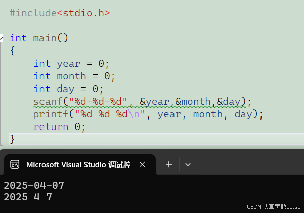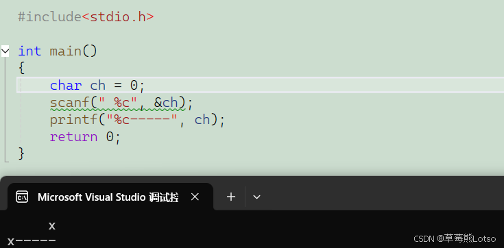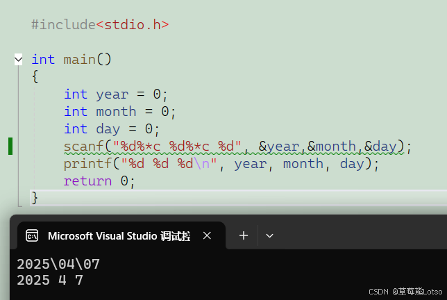 为了避免这种情况,scanf提供了一个赋值忽略符 *,比如%*c。只要吧*号加到任何百分号后面,该占位符就不会返回值,解析后被丢弃。我们直接通过一个例子来感受一下吧,就拿上面的这个例子来试试~