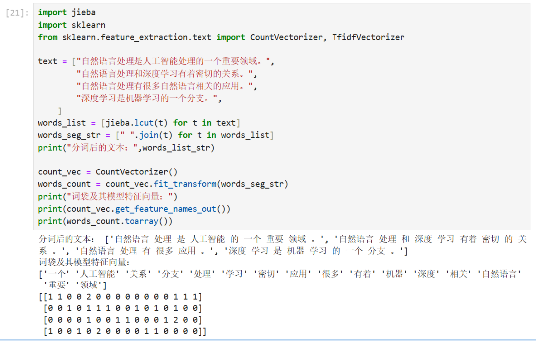 CountVectorizer 是文本特征提取的基础工具,它实现了词袋模型(Bag of Words, BoW),将文本转换为词频矩阵。