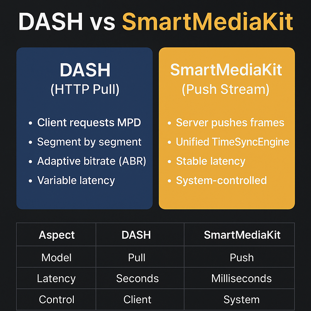 - 多路画面并列对比(双目/多摄),我们需要“帧到帧可控的对齐”。DASH 把时间放在片段与客户端推理层,全局对齐代价高。