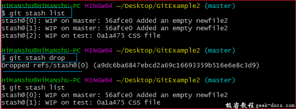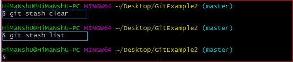 上方的输出说明,所有的暂存记录都被删除了,Git stash list命令是空白的,因为暂存区中没有可用的暂存记录了