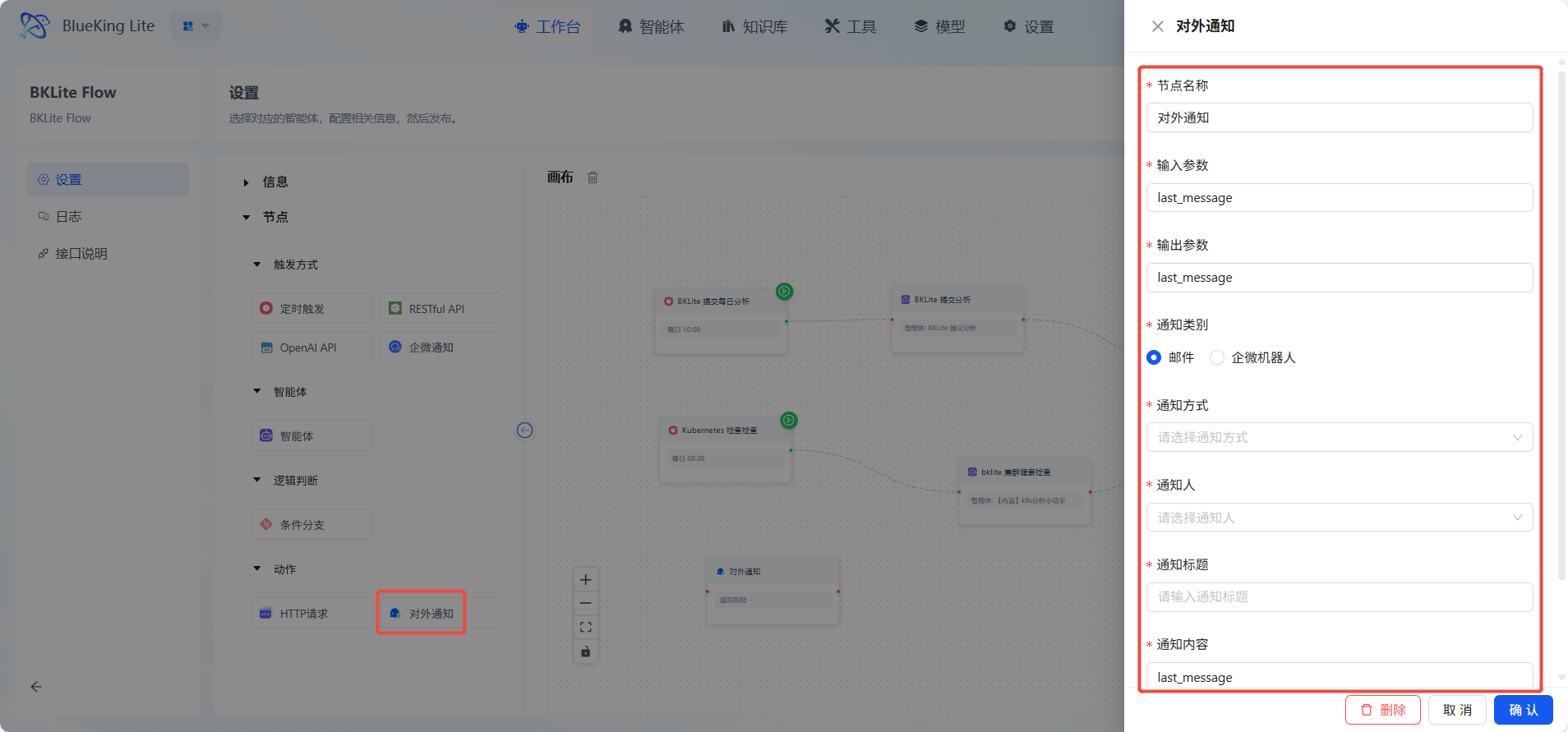 对外通知:是工作流与用户或外部系统通信的“嘴巴”。它负责将流程的处理结果、重要状态或AI生成的内容,通过指定的渠道主动发送出去。