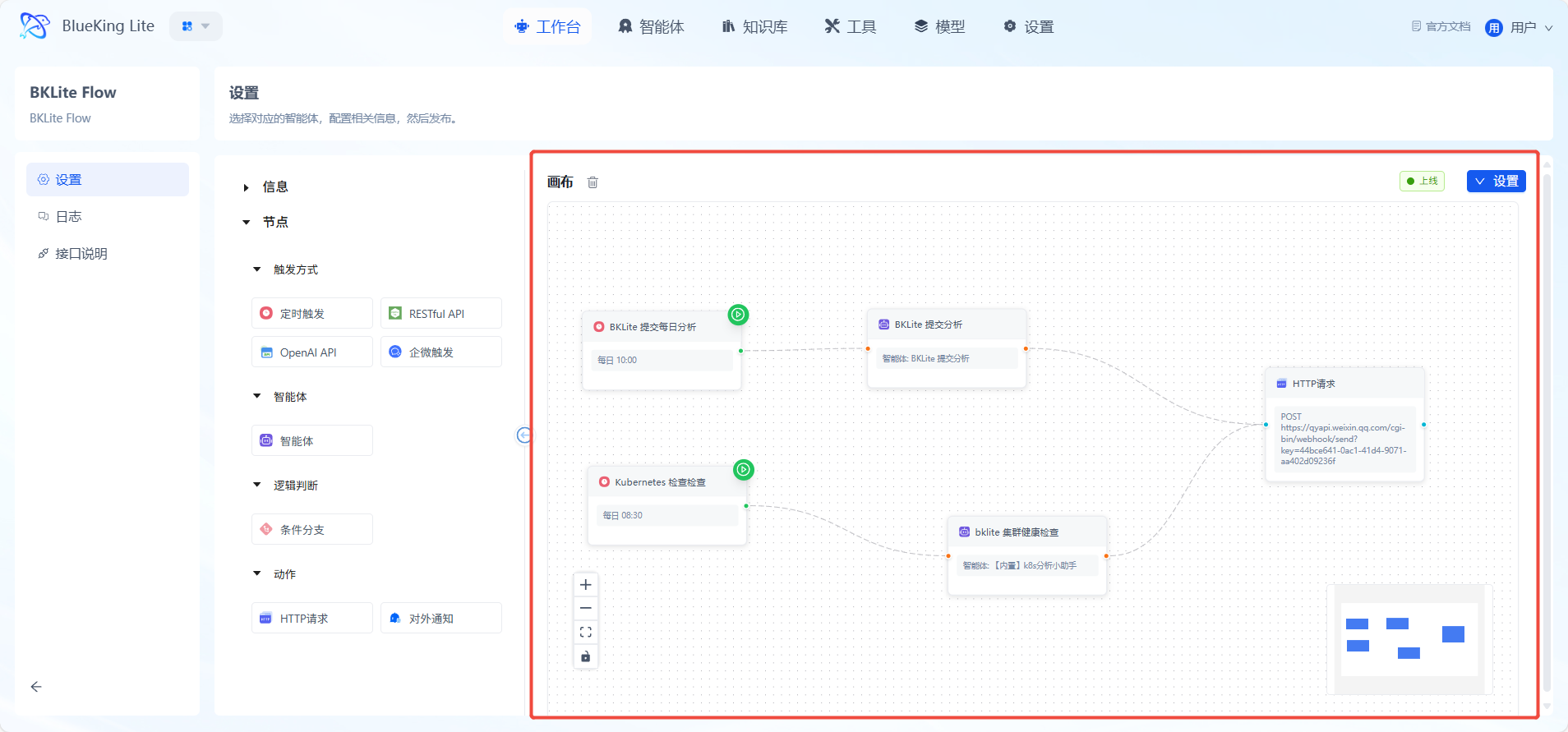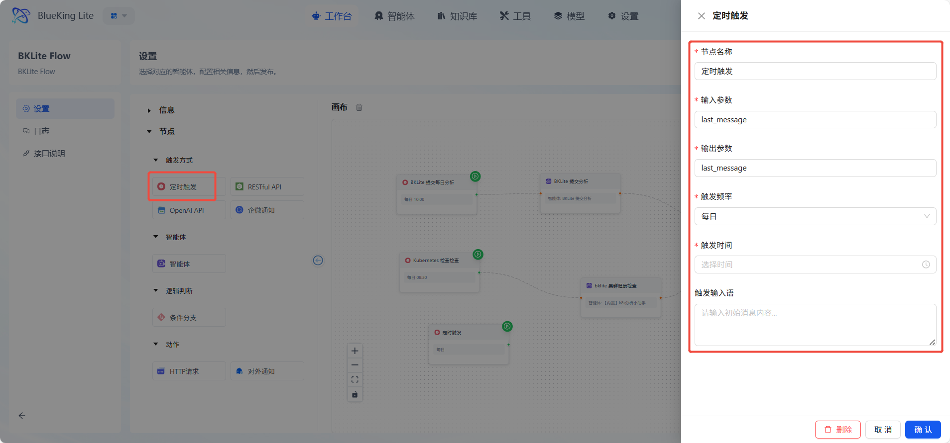 触发方式节点是工作流的入口,负责启动整个流程。它定义了应用如何被激活,节点检测到匹配的输入信号时,会自动触发后续流程执行。包括定时触发、RESTful API、OpenAI API、企微通知。