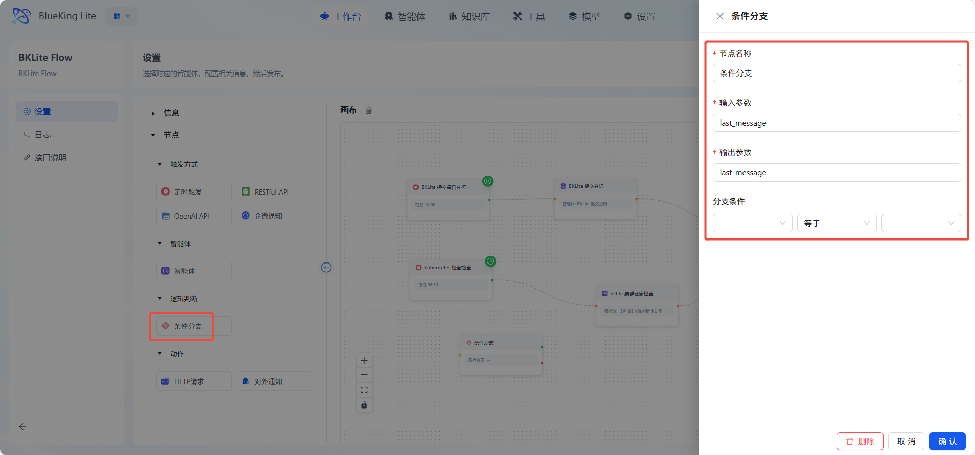 逻辑判断节点提供流程的分支控制能力,支持基于规则的条件路由。节点允许配置多条件判断逻辑,该节点支持嵌套条件配置,能够实现复杂的多层级决策树,确保流程能灵活应对各种业务场景。