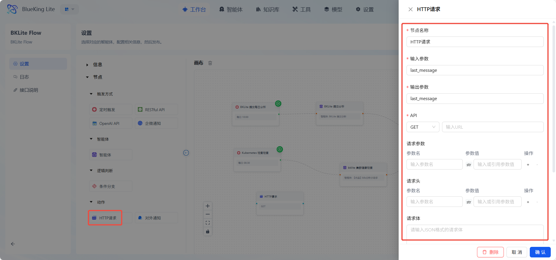 动作节点是工作流的执行终端,负责将处理结果转化为实际操作。该节点通常作为流程的最终环节,将智能决策转化为具体的业务行动,如发送邮件、更新订单状态或返回结构化数据。包括HTTP请求、对外通知。
