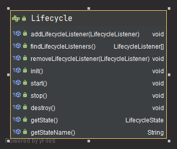 我们看到了getParent、SetParent、addChild和 removeChild等方法,这里正好验证了我们说的组合模式。我们还看到 Container接口拓展了 Lifecycle ,Tomcat 就是通过 Lifecycle 统一管理所有容器的组件的生命周期。通过组合模式管理所有容器,拓展 Lifecycle 实现对每个组件的生命周期管理 ,Lifecycle 主要包含的方法init()、start()、stop() 和 destroy()。