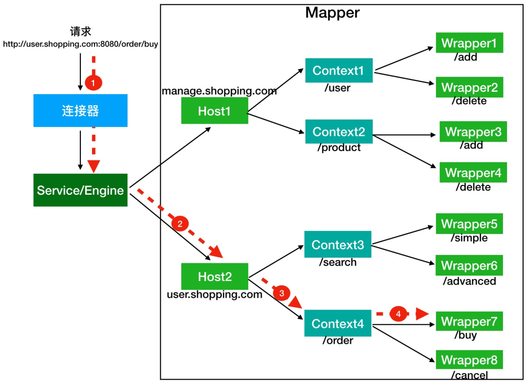 假如有用户访问一个 URL,比如图中的http://user.shopping.com:8080/order/buy,Tomcat 如何将这个 URL 定位到一个 Servlet 呢?