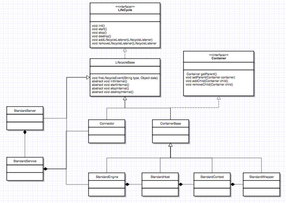Tomcat 就是用组合模式来管理这些容器的。具体实现方法是,所有容器组件都实现了 Container接口,因此组合模式可以使得用户对单容器对象和组合容器对象的使用具有一致性。这里单容器对象指的是最底层的 Wrapper,组合容器对象指的是上面的 Context、Host或者 Engine。Container 接口定义如下: