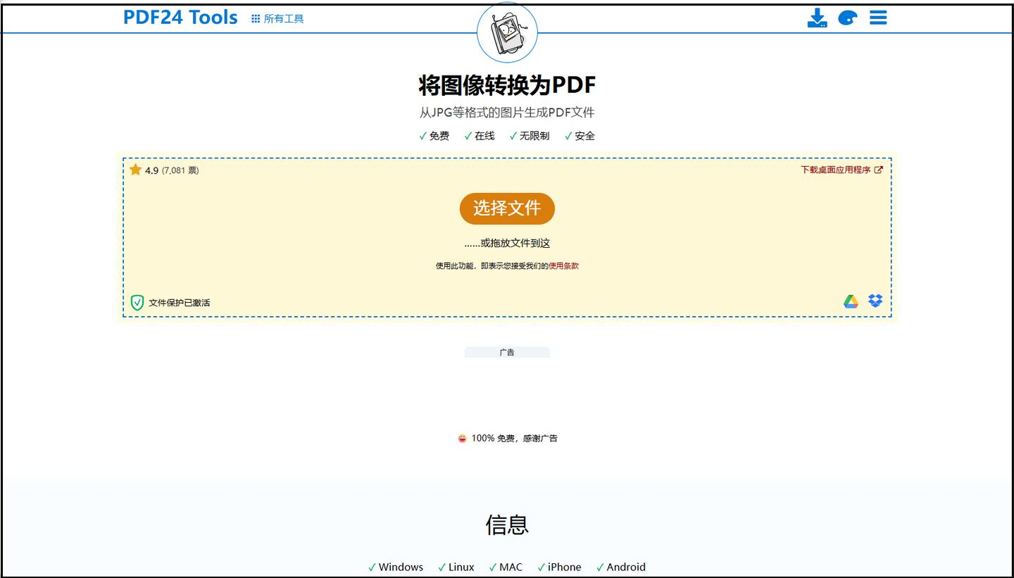 打开工具的“将图像转换为PDF”页面,点击【选择文件】上传图片、直接点击转换按钮,转换完成后下载PDF文件。