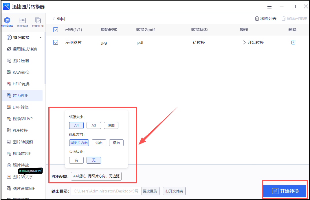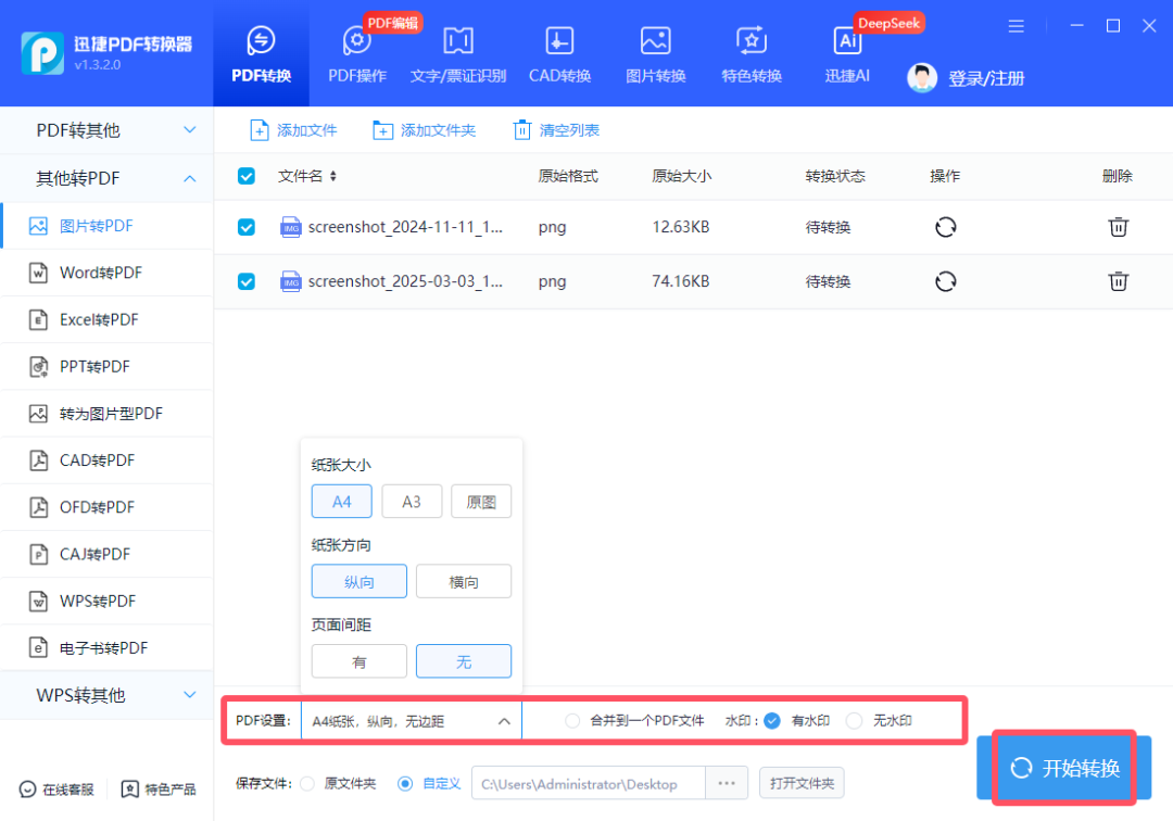 打开软件,点击【PDF转换】—【其他转PDF】—【图片转PDF】功能,上传文件;设置PDF的纸张方向/大小、页面边距,点击【开始转换】按钮即可!