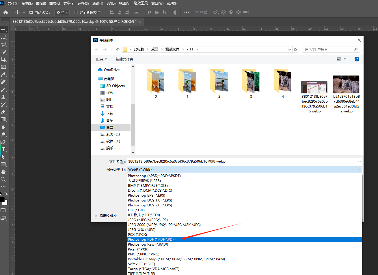 将图片导入PS中,然后点击左上角的【文件】—选择【储存副本】,选择保存格式为PDF即可完成转换!