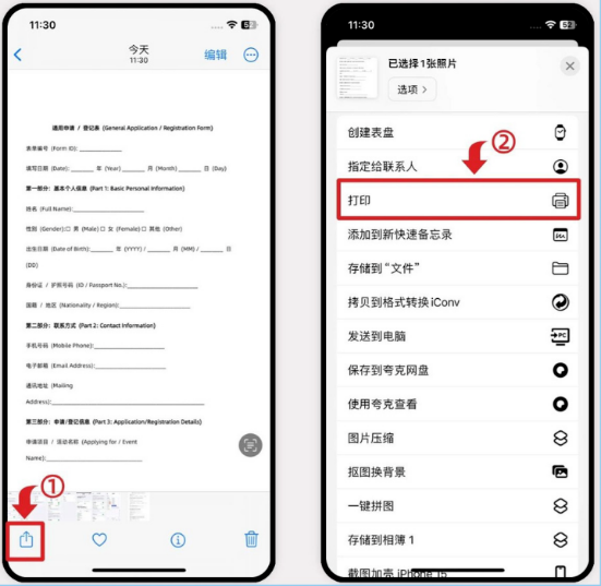 打开相册长按、点击右上角【选择】勾选所有需要转换的图片(最多50张!);接着在左下角点击【分享】图标、找到【打印】工具;