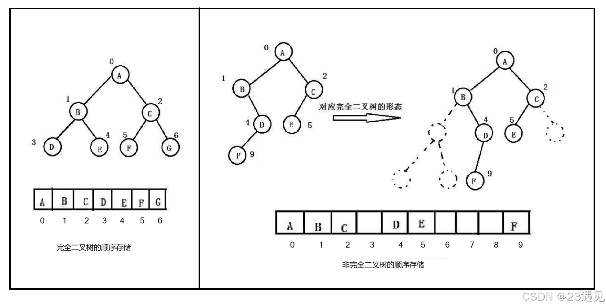普通的二叉树是不适合用数组来存储的,因为可能会存在大量的空间浪费。而完全二叉树更适合使用顺序结构存储。现实中我们通常把堆(一种二叉树)使用顺序结构的数组来存储,需要注意的是这里的堆和操作系统虚拟进程地址空间中的堆是两回事,一个是数据结构,一个是操作系统中管理内存的一块区域分段。