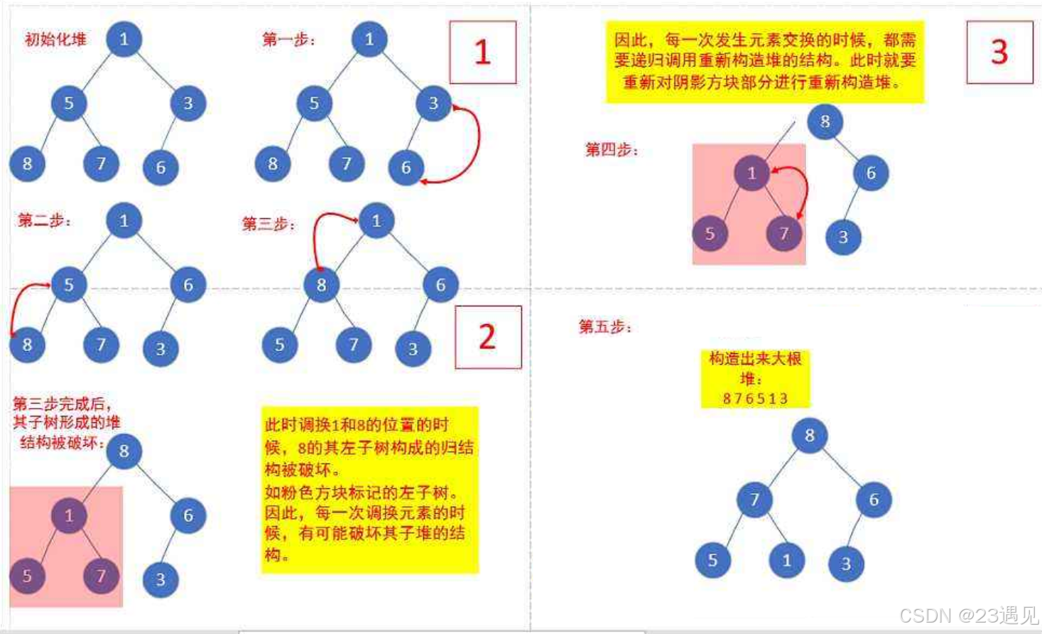 }堆排序是利用堆的思想进行排序,分为两个步骤: