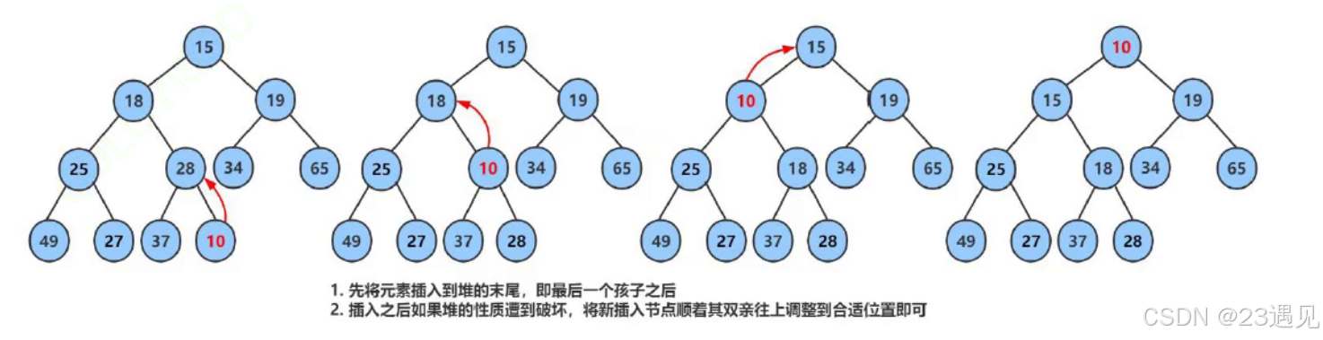先插入一个10到数组的尾,再进行向上调整算法,直到满足堆。