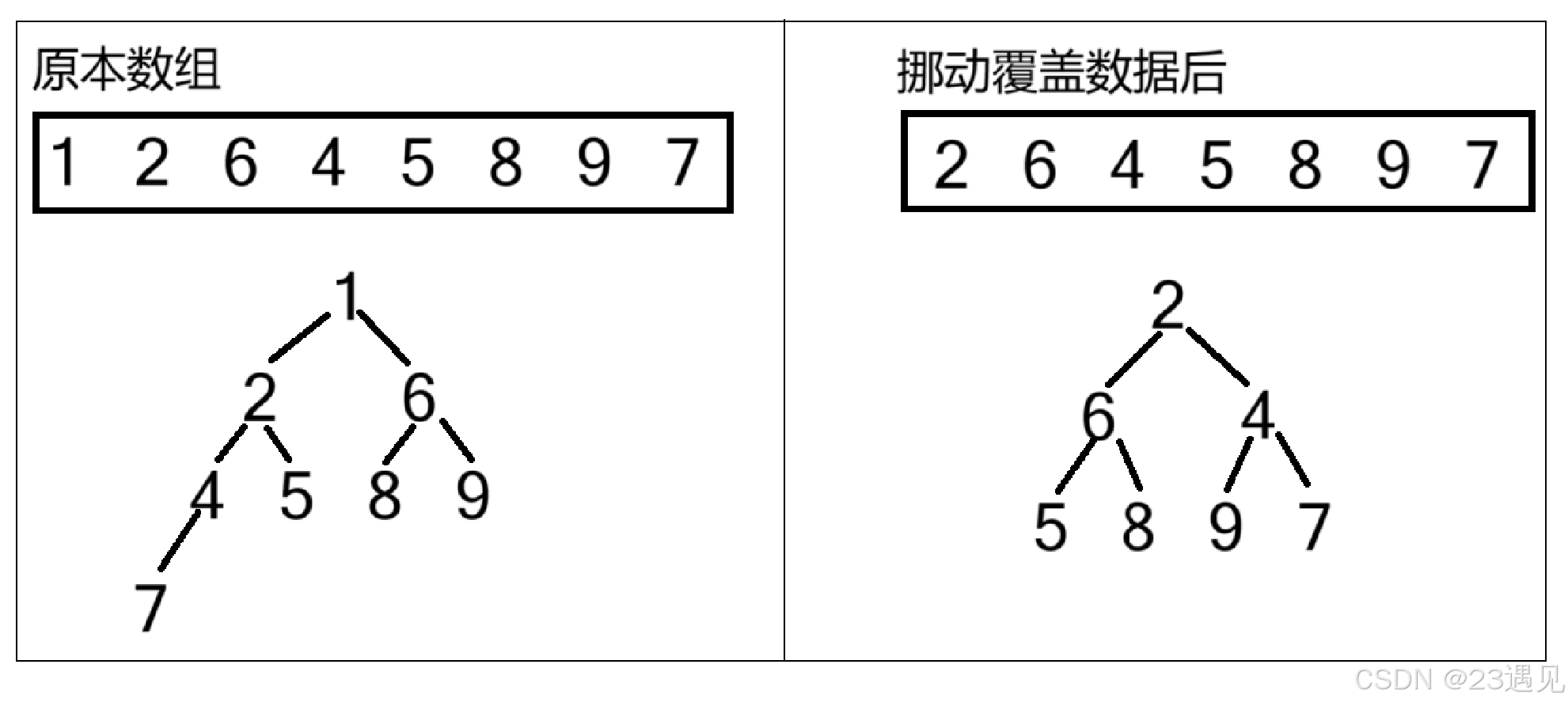若挪动覆盖删除堆顶数据,关系就乱了,兄弟变父子,叔侄变兄弟……