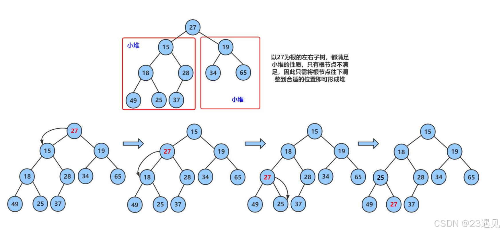 给出一个数组,逻辑上看成一棵完全二叉树。我们通过从根结点开始的向下调整算法可以把它调整成一个小堆。向下调整算法有一个前提:左右子树必须是一个堆,才能调整。