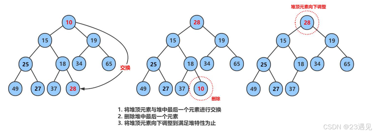 删除堆是删除堆顶的数据,将堆顶数据和最后一个数据交换,然后删除数组的最后一个数据,再进行向下调整算法。