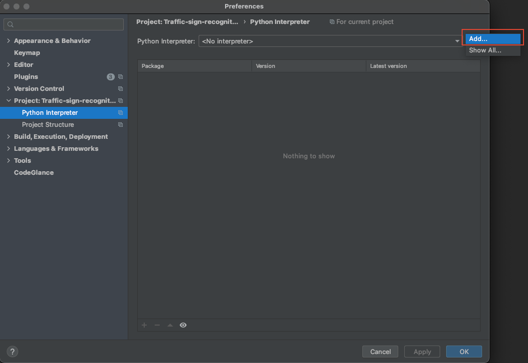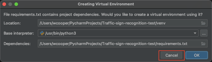 Cancel取消创建虚拟环境,我们使用环境搭建步骤中所创建的环境: