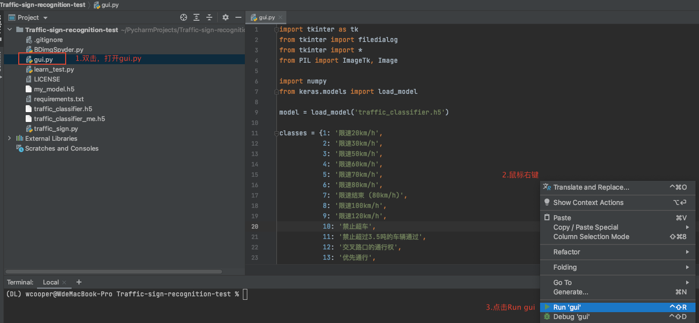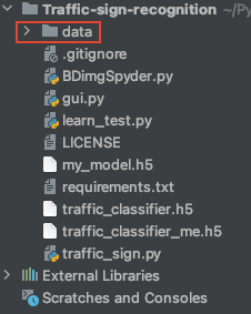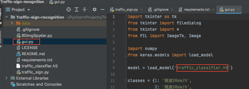 Run 运行代码,运行时长与是否有独立显卡有关,耐心等待运行结束后,会生成一个名为 my_traffic_classifier.h5 的模型 h5 文件。gui.py 文件,修改模型路径名为刚刚生成的my_traffic_classifier.h5