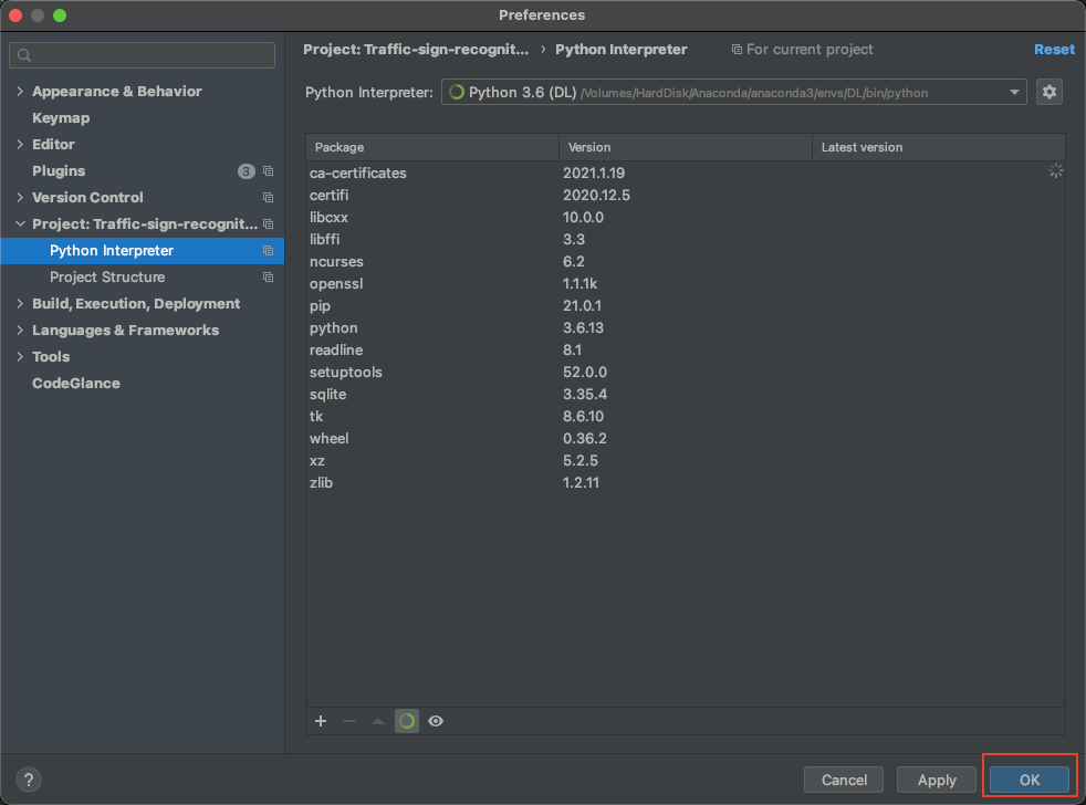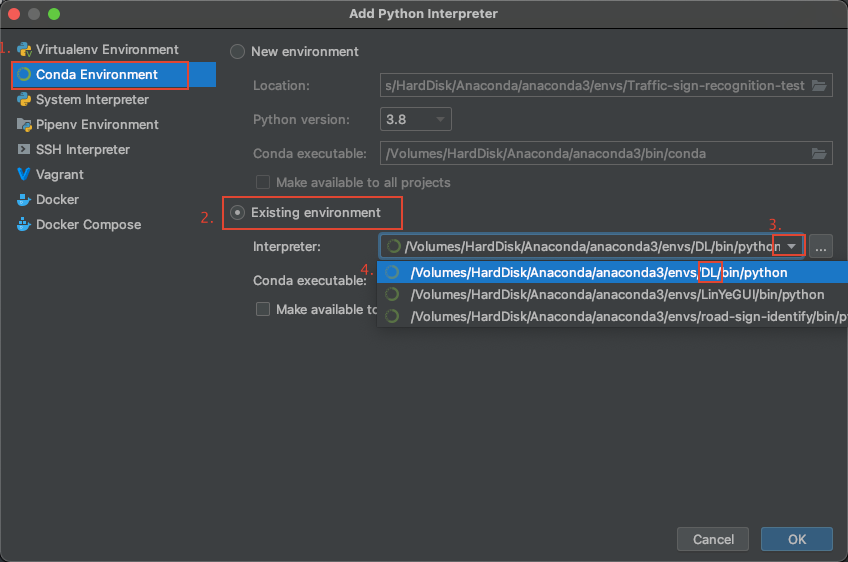 Anaconda 环境,这里为 DL 环境,然后选择,点击 OK: