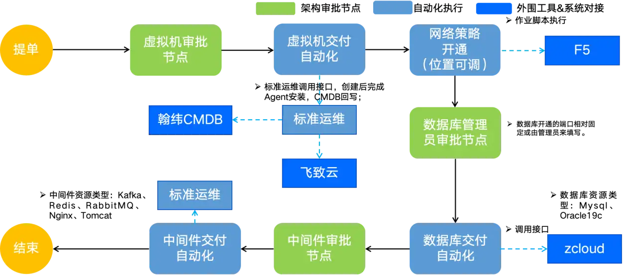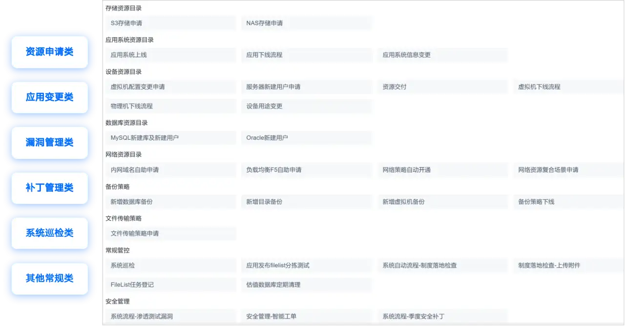以资源交付流程为例,通过ITSM流程引擎,实现了复杂的多资源交付,将分散的资源管理平台通过流程进行串联并实现自动化执行,将此类需求的周期从按周缩短到按小时交付。提高了交付效率的同时也满足了标准化、安全、合规、可追溯的需求。