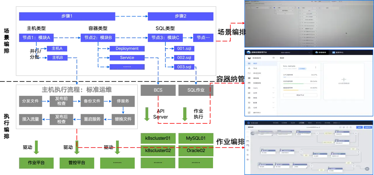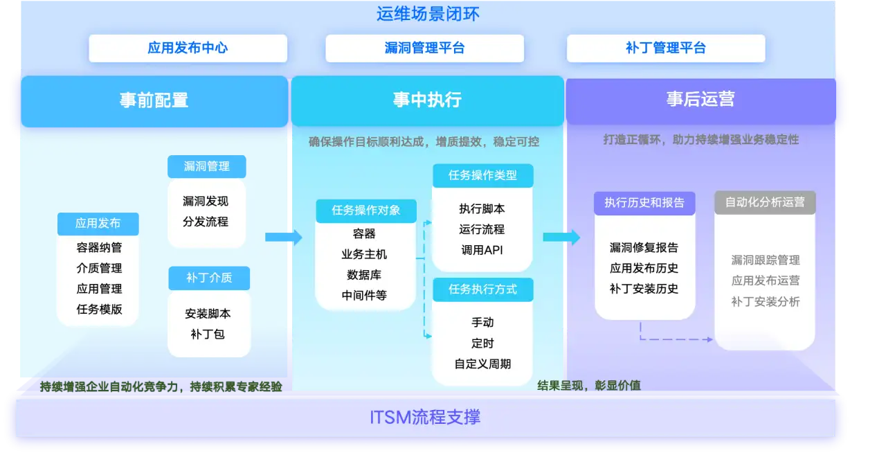 支撑自动化运维的主要包括通道能力、脚本原子能力、流程编排能力、场景化能力,其中场景化能力是决定自动化运维使用效果的关键因素,运维各部门人员将不再直面繁琐的脚本与流程编排,而是直接获取场景化中可持续复用的原子能力与规范化的任务模版发起自动化任务,降低自动化能力的使用门槛,并基于场景形成闭环管理。