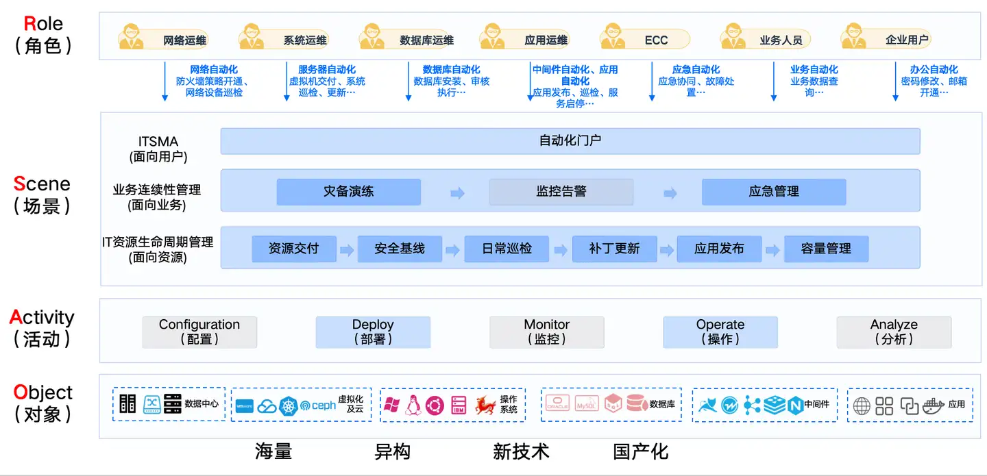 自动化运维业务架构分为基础设施即对象层、活动即原子层,场景层即SaaS层以及角色层,构建服务于角色、注重用户体验、合规安全,同时可持续横行、纵向扩展的灵活架构,满足当前基金公司敏态发展与管理的需求: