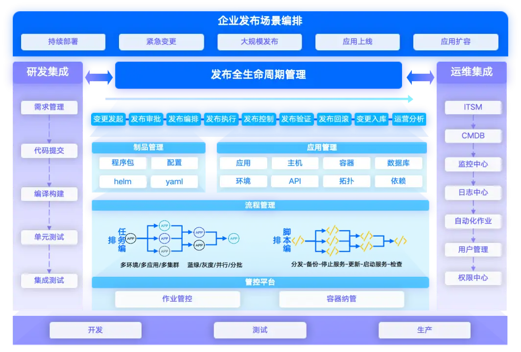 在微服务及容器化技术大规模应用以及系统双活改造的背景下,传统的应用发布变得难以适应生产需求,每一次发布都面临着大量的需求对接、节点梳理、配置审核等工作,复杂场景下的发布更是需要投入大量人力进行保障。通过应用发布自动化+ITSM流程相结合的方式可将各系统常用的发布场景固化为发布任务模版,在每次需要发布时进行微调、检查、固定流程审批后即可进行快速、准确的发布。