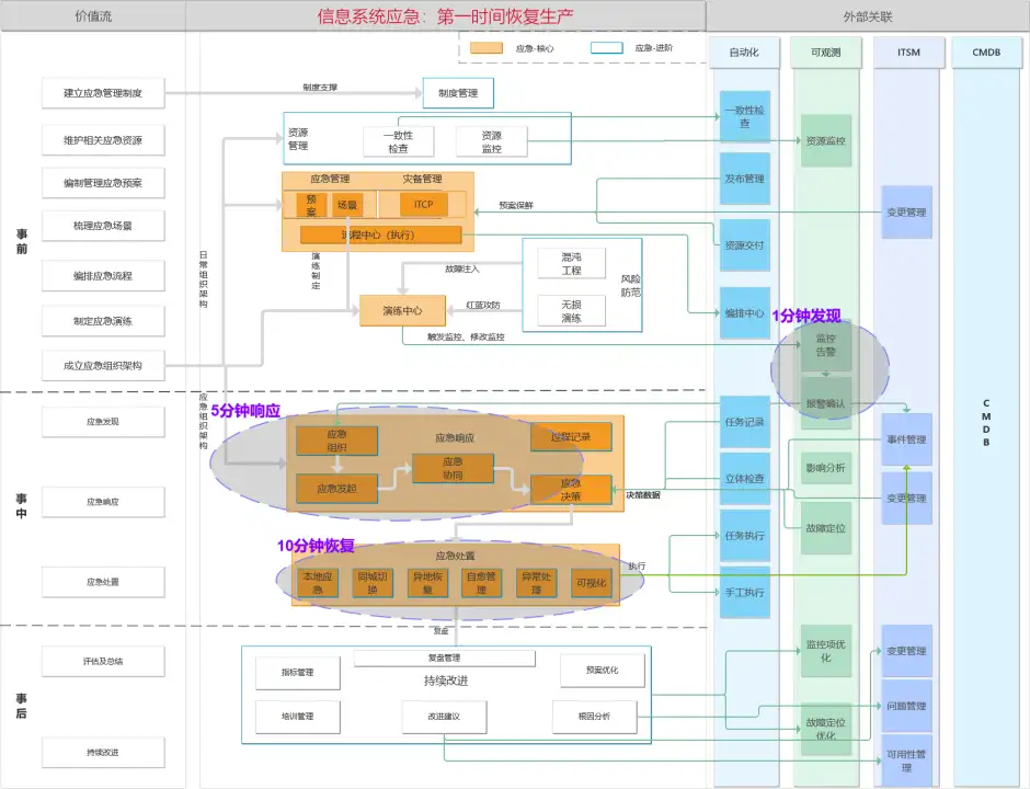 除了灾备管理之外,应急管理是一个范围更大的课题,随着外部网络安全威胁的加剧,基金公司需要防患于未然,建立各类场景下的应急预案。与灾备切换同理,线下管理方式存在诸多弊端。通过应急管理自动化+ITSM流程相结合的方式,能够有效的对场景、预案、制度文件、组织人员、应急响应、应急任务、应急报告进行管理与能力持续提升,同时充分联动“监”(可观测)、“管”(CMDB、ITSM)、“控”(自动化)能力,让IT应急管理逐步朝“1-5-10”(1分钟发现、5分钟定位、10分钟恢复)靠近,实现事前、事中、事后的体系化管控。