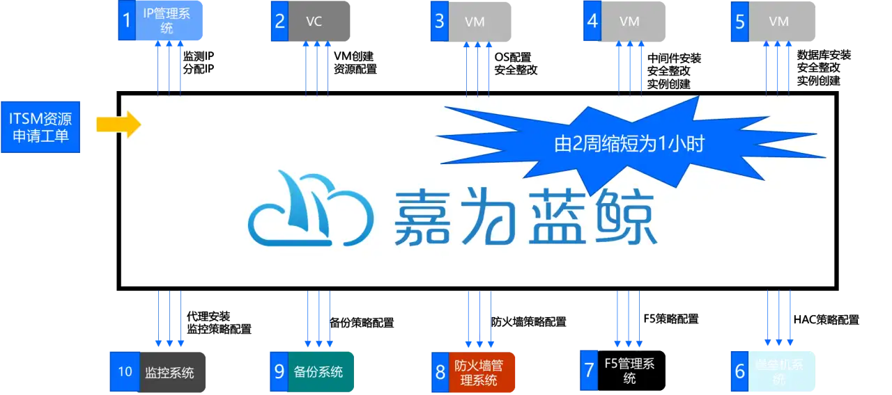 IT资源的管理分散在不同的平台并且由不同的部门进行管理,当产生一个资源申请需求时会面临跨系统、跨部门的复杂协作,同时需要层层严谨的评估审核,导致整个资源交付的周期较长,无法满足敏捷化的管理模式。若通过自动化+ITSM流程相结合的方式,则可以将整个过程实现规范化管理并大大减少交付周期。