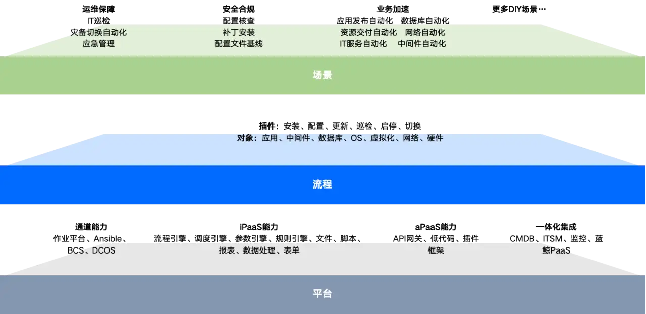 自动化运维技术架构如下,通过平台层提供的通道能力、运维PaaS能力、调度引擎能力、流程引擎能力、一体化集成能力不断沉淀自动化原子、标准运维流程、场景,满足上方的业务架构需求,将自动化能力转化为公司宝贵的IT资产: