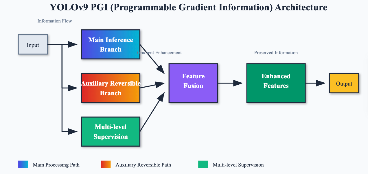 YOLOv9最具创新性的地方在于其独特的信息流动机制。传统网络中,信息只能单向流动,每经过一层变换就会产生不可逆的信息损失。而YOLOv9通过PGI构建了多条并行的信息通道: