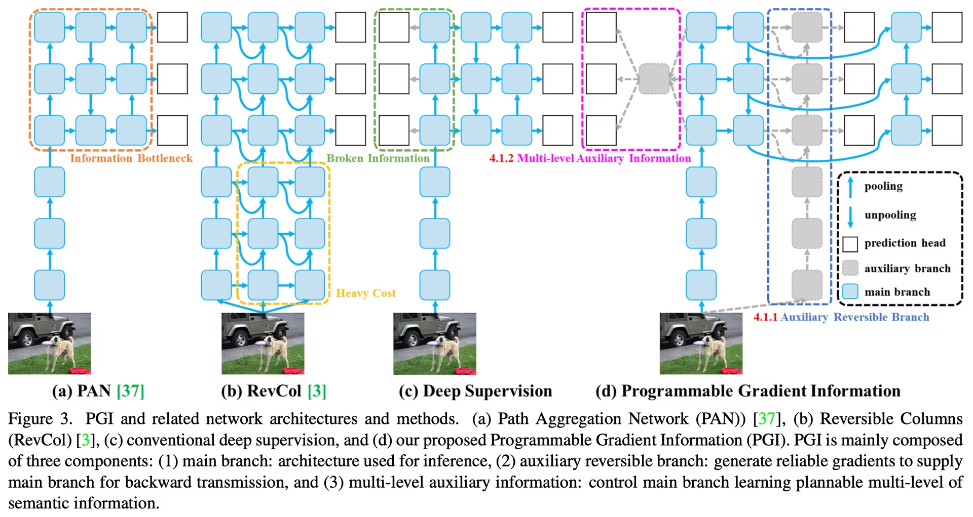 YOLOv9 引入了 PGI,这是一种通过使用辅助可逆分支生成可靠梯度的创新方法。这个辅助分支为计算目标函数提供了完整的输入信息,确保用于更新网络权重的梯度更具信息量。辅助分支的可逆性保证了在正向传播过程中不会丢失任何信息。