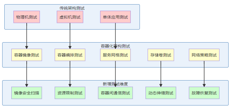 这个图展示了从传统架构到容器化架构,测试维度的显著增加。每增加一个维度,就意味着更多的测试复杂性。