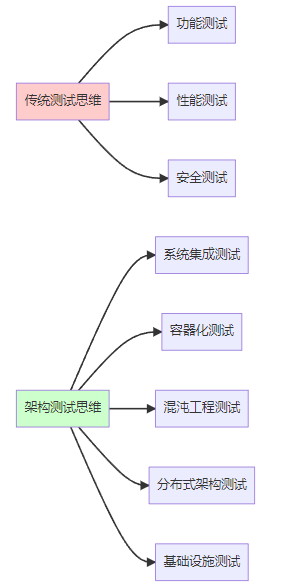 上图清晰地展示了两种测试思维的差异。传统测试更关注单点功能,而架构测试则从整体系统的角度考虑问题。