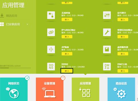 在电脑浏览器输入tplogin.cn(或192.168.1.1)。进入路由器管理界面后,点击 应用管理,找到 DDNS,点击 进入。
