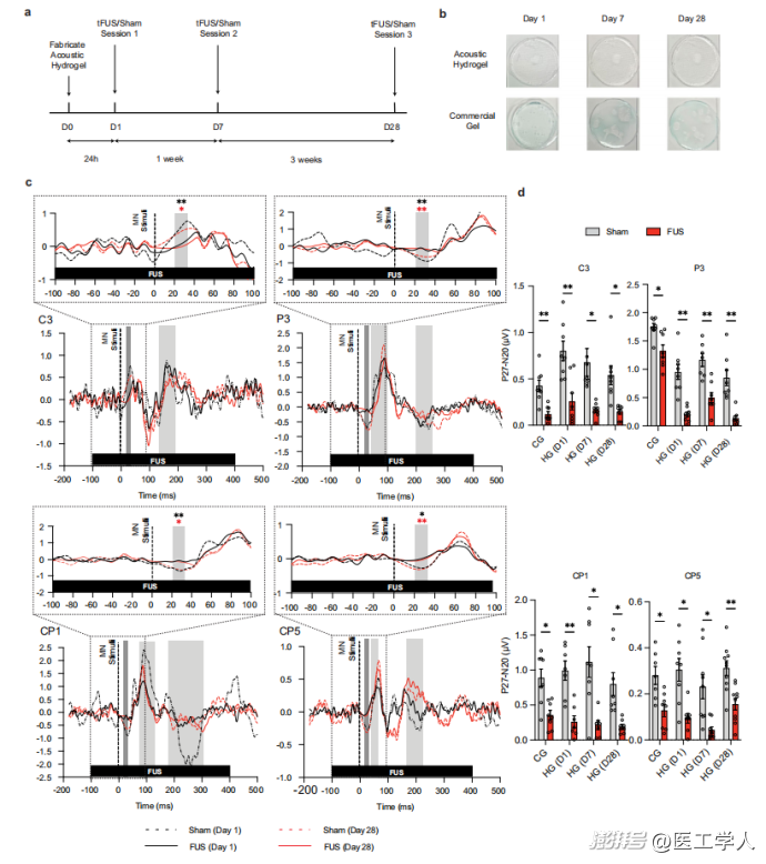 图4. MiniUITra长期抑制SEP的效果。a,b)实验流程及28天后水凝胶与商用凝胶的状态对比。c)第1天和第28天的SEP波形图,红色实线(FUS刺激)的波幅明显低于黑色虚线(假刺激)。d)数据统计显示,在第1、7、28天,FUS均能显著抑制P27-N20波幅,且效果稳定。