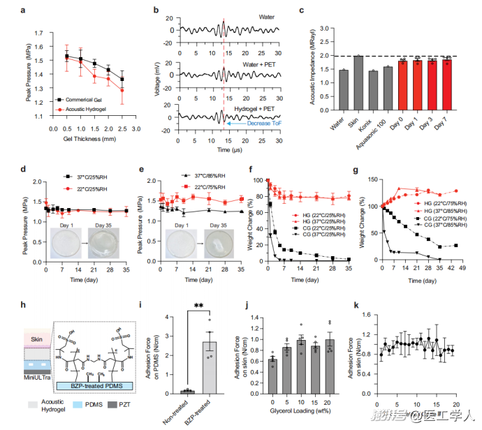 图3. 生物粘附水凝胶的特性。a)其声衰减与商用凝胶相当。b,c)其声阻抗稳定且与皮肤更匹配。d,e)在不同温湿度下,水凝胶的声压衰减在35天内保持稳定。f,g)与商用凝胶相比,该水凝胶表现出优异的保水和吸湿能力。i,j,k)水凝胶与设备基底和皮肤均有强大且可重复的粘附力。