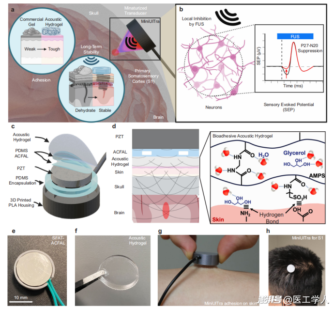 图1:微型化生物粘附超声换能器 (MiniUITra) 系统。 a) MiniUITra可像贴片一样长期附着于头皮,靶向刺激大脑皮层,解决了传统凝胶易脱水、黏附性差的问题。b) 其机制是通过聚焦超声(FUS)抑制特定神经活动,如图中对感觉诱发电位(SEP)的P27-N20波的抑制。c-h) 展示了设备的层状结构、水凝胶的化学构成、设备实物及佩戴在头皮上的状态。