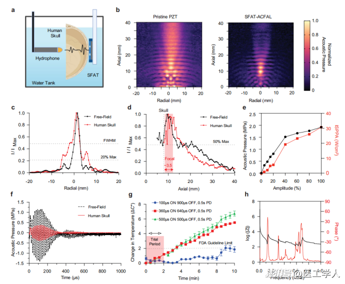 图2:自聚焦声学换能器 (SFAT) 的性能表征。 a) 声场测试示意图。b) 与普通换能器(左)相比,SFAT-ACFAL(右)的声场聚焦效果显著提升。c,d)在有无颅骨情况下的径向和轴向声强分布,显示其焦点深度为10mm,横向分辨率为8mm。e)声压与驱动电压呈线性关系。f)穿过颅骨后声波波形发生衰减。g)在不同刺激参数下,设备的热效应均在FDA安全指南范围内。h)设备的电阻抗谱。