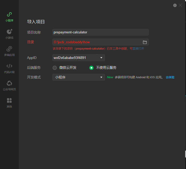 在“目录”下选择你第一步所选择的文件夹。AppID默认会显示出和你登入的微信号相关联的ID号,直接选择即可。我们的小程序非常简单,用不到微信云开发,直接选择“不使用云服务”。