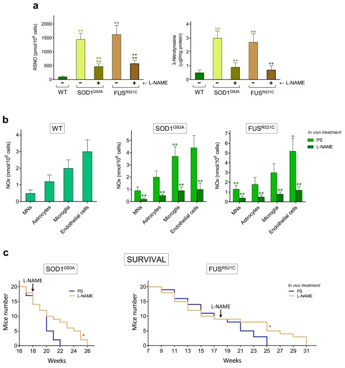西班牙瓦伦西亚大学的实验人员在上述论文中研究了肌萎缩侧索硬化症(ALS)的病理机制与潜在干预策略。通过两种 ALS 小鼠模型(SOD1G93A 转基因小鼠、FUSR521C 转基因小鼠),探讨了Nicotinamide riboside(NR)、Pterostilbene (PT)与Ibudilast(IBU)联合使用对运动神经元保护及小鼠存活的影响,并深入解析其作用机制。主要发现以下机制:ALS 病理损伤的核心机制为 “促炎细胞因子→H₂O₂/NO 生成→・OH/・OONO⁻积累→运动神经元氧化损伤”的级联反应。Nicotinamide riboside 通过补充 NAD + 激活抗氧化通路,Pterostilbene 通过激活 Nrf2 增强抗氧化防御,Ibudilast 通过抑制 PDE 降低 TNFα 水平,三者协同作用可阻断氧化应激与亚硝化应激,减少神经炎症,保护线粒体功能,最终实现对运动神经元的保护。由AbMole提供的L-NAME(NG-nitro-L-arginine methyl ester,AbMole,M2818)作为一氧化氮合酶(NOS)的特异性抑制剂,在本研究中用于验证 NO 在 ALS 病理进程中的直接作用。通过腹腔注射 L-NAME(20 mg/kg/天,自18周起给药至小鼠死亡),可显著降低ALS小鼠运动神经元、胶质细胞及内皮细胞的 NO 生成量(NOx 水平较对照组减少 40%-50%),并降低亚硝化应激标志物(亚硝基硫醇、3-硝基酪氨酸)的水平,证明 NO 是ALS模型中促损伤的关键分子[10]。