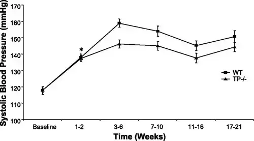图 1. Systolic blood pressures during L-NAME and high-salt administration.