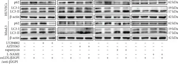 江苏大学附属医院的实验人员在上述文章中,探究了动脉粥样硬化(AS)合并抗磷脂综合征(APS)背景下,氧化低密度脂蛋白/β2糖蛋白I / 抗β2糖蛋白I抗体复合物(oxLDL/β2GPI/anti-β2GPI)对血管内皮细胞自噬的调控机制,及其与内皮细胞功能障碍的关联。实验人员以人脐静脉内皮细胞(HUVECs)和小鼠脑内皮细胞(bEnd.3)为模型,通过 Western blot、透射电镜(TEM)及 mRFP-GFP-LC3 腺病毒转染实验发现:oxLDL/β2GPI/anti-β2GPI 复合物可以抑制内皮细胞自噬,并且在复合物处理后,细胞的PI3K(Tyr458)、AKT(Ser473)、mTOR(Ser2448)及 eNOS(Ser1177)磷酸化水平显著升高(峰值出现于处理后的30-45 分钟),且 AKT 抑制剂 AZD5363可抑制 eNOS 磷酸化,证明eNOS是AKT的下游靶点。来自AbMole的L-NAME(N (ω)-nitro-L-arginine methyl ester,M2818)在本研究中用于验证 eNOS 通路在复合物调控内皮细胞自噬中的必要性,L-NAME预处理HUVECs和bEnd.3细胞(100μM,4 小时),可抑制 oxLDL/β2GPI/anti-β2GPI 复合物诱导的 eNOS 磷酸化(Ser1177),从而阻断 eNOS 通路激活[11]。