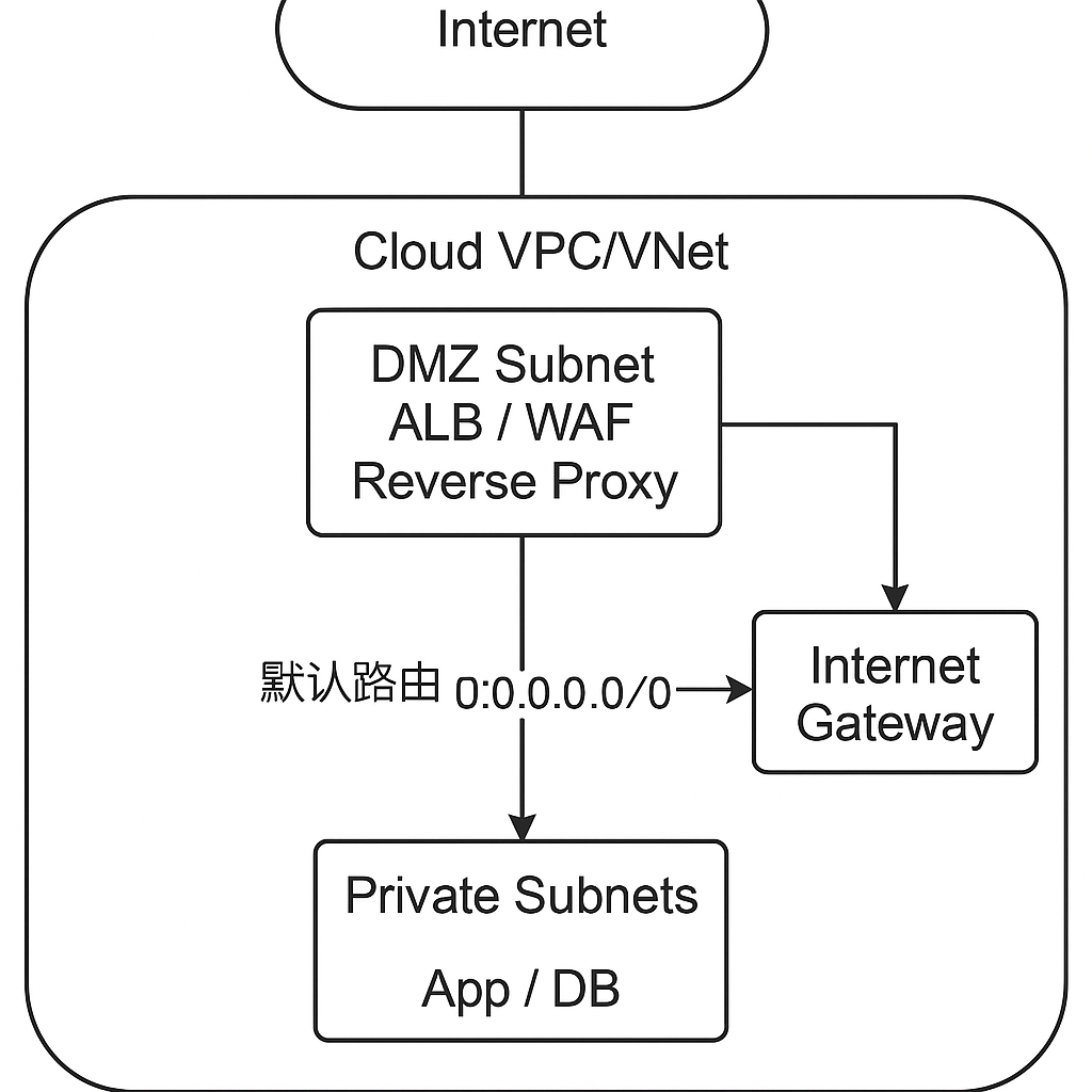 - DMZ 子网(如 10.0.10.0/24)直接连接 Internet Gateway,承载外部访问点(如 ALB/WAF/Proxy)。